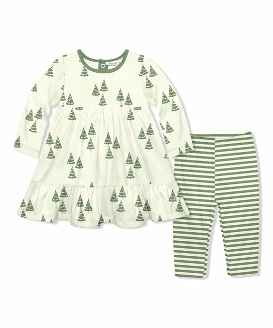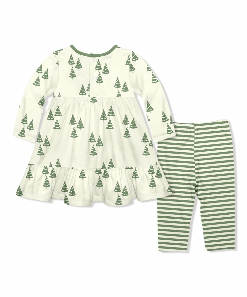 - Includes cream Christmas trees babydoll dress and green stripe leggings (two pieces total)