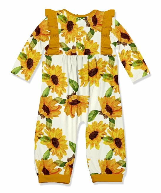 This playsuit is designed to provide all-day comfort with ample stretch. The ruffled trim and the bold print add smiles.