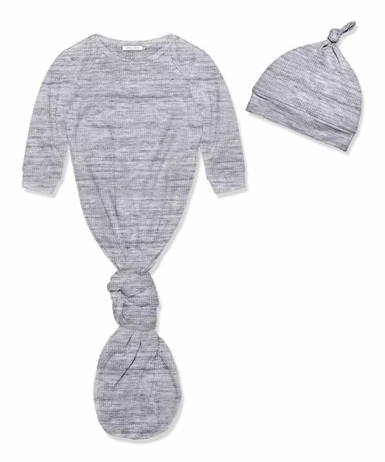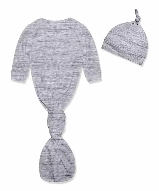 - Includes heather gray knotted gown and matching knot-tie beanie (two pieces total)