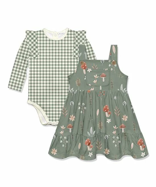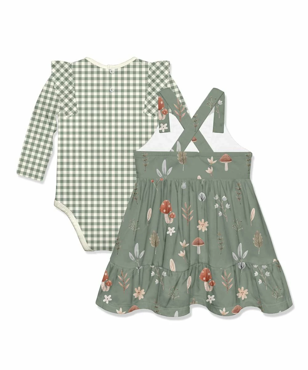 - Includes one loden frost gingham bodysuit and one loden frost mushroom leaf a-line dress (two pieces total)