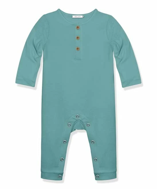 Henley playsuit made with cotton material and a hint of stretch. Bottom snaps make change times easy.