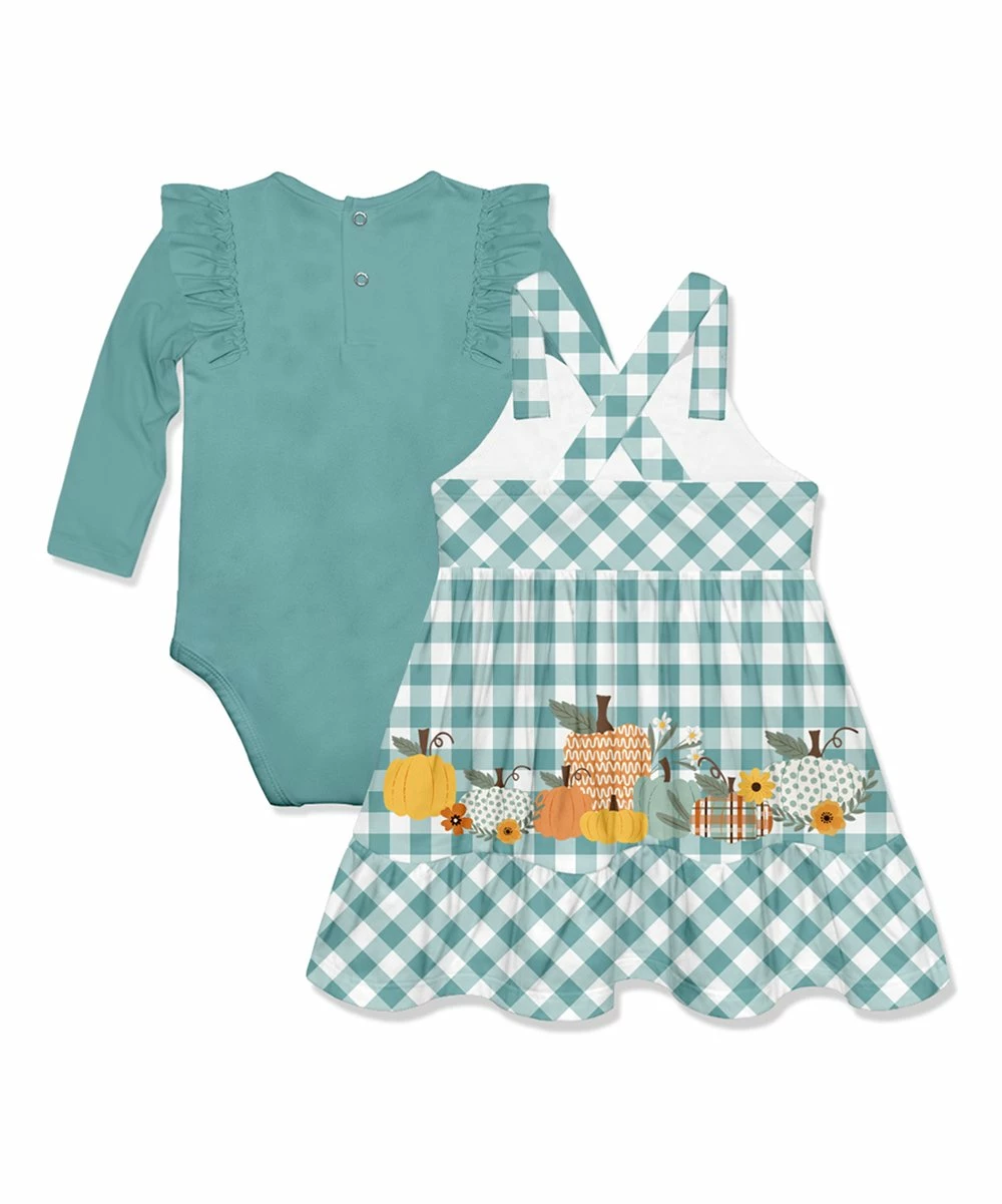 - Includes blue bodysuit and blue gingham jumper (two pieces total)