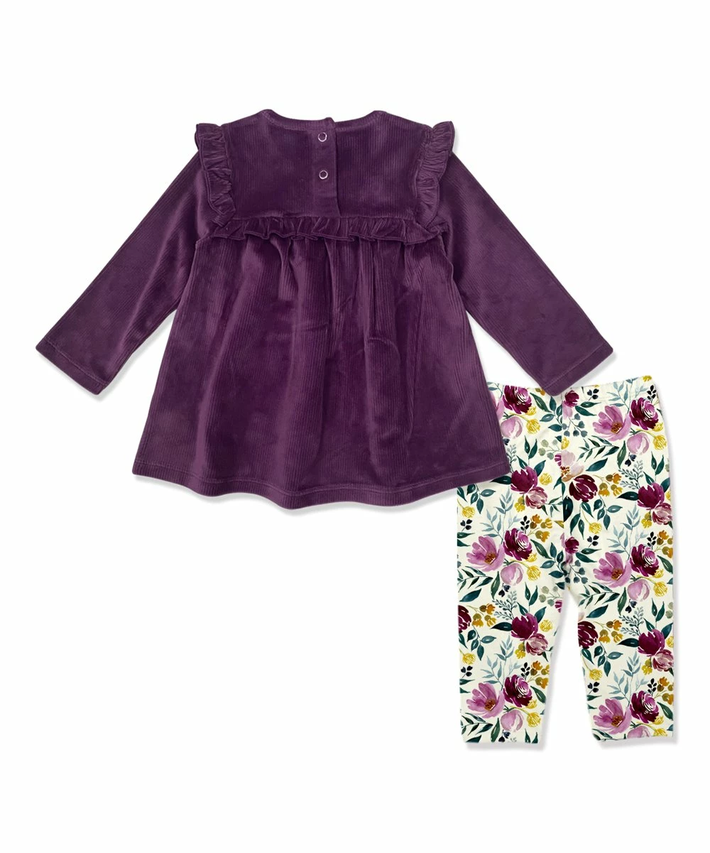 - Includes a plum velour ruffle-accent tunic and cream Fall petals leggings (two pieces total)