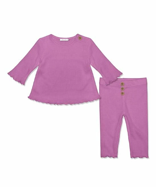 Long-sleeve waffle-knit tee and matching pull-on pants with decorative buttons. Both decorated with a ruffled hem.