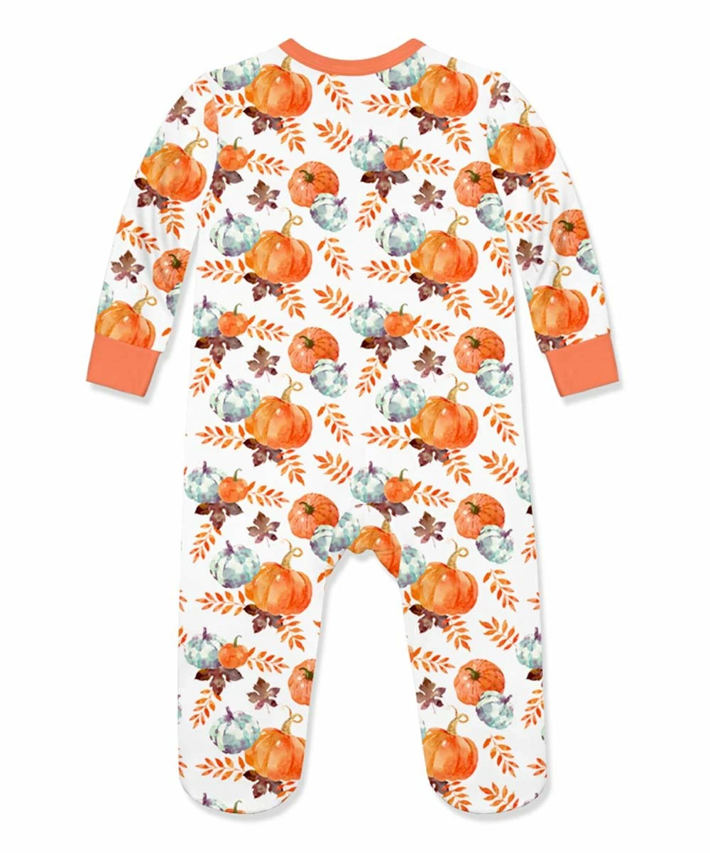 Made from a stretch-infused fabric, this zip-closure footie is machine washable and features a ruffle accent and an autumnal print.