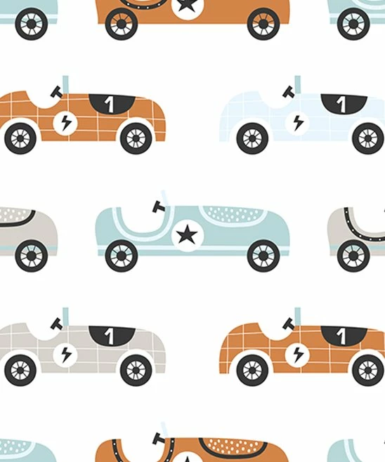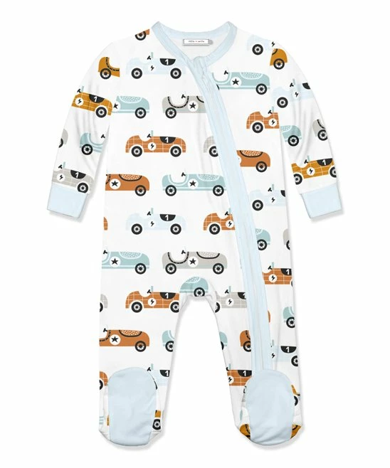 Footie featuring a fun race car print and stretch-infused fabric. A front-facing zipper allows for easy changes.