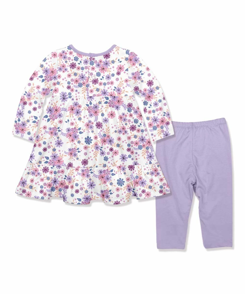 - Includes white and lilac meadow flower long-sleeve babydoll dress and lilac leggings (two pieces total)