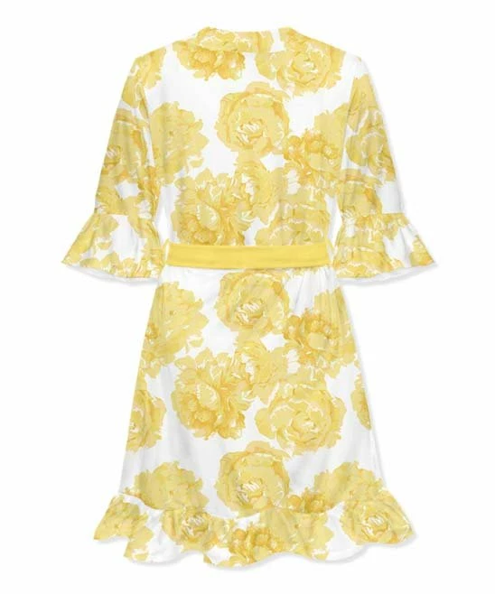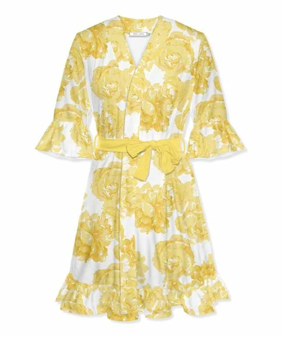 Stretch-infused robe fashioned with trumpet sleeves and a ruffle hem.