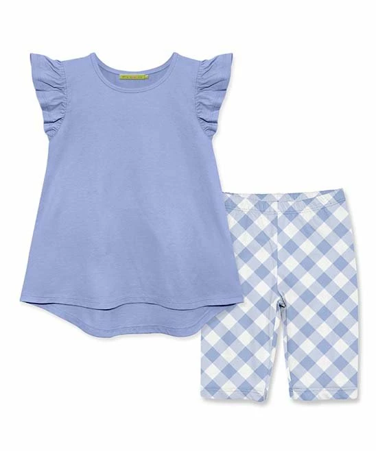 - Includes periwinkle angel-sleeve hi-low top and periwinkle and white gingham bike shorts (two pieces total)