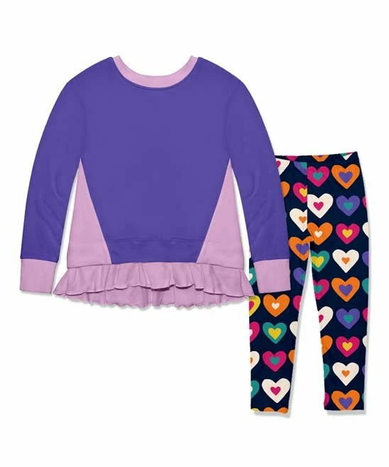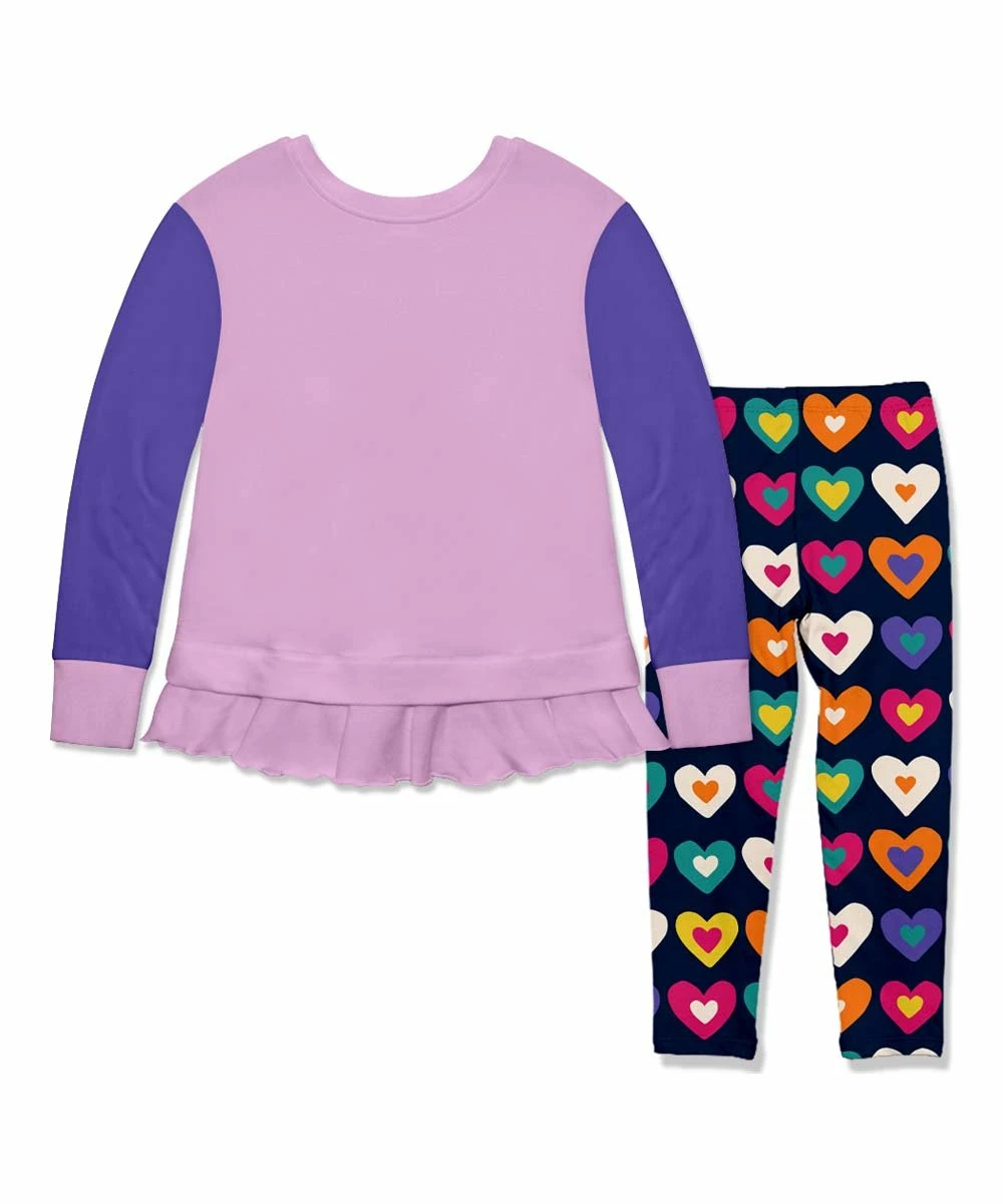 - Includes blue iris ruffle-hem French terry sweater and graphic heart leggings (two pieces total)