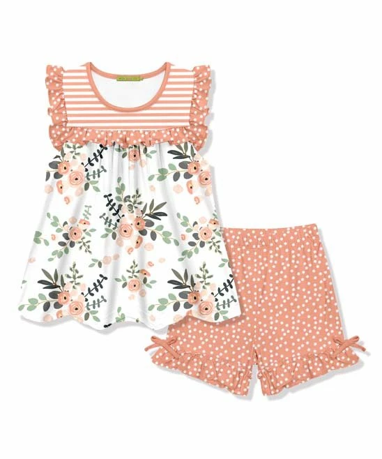 - Includes a coral and white stripe floral ruffle A-line top and coral and white polka dot ruffle side-bow shorts (two items total)