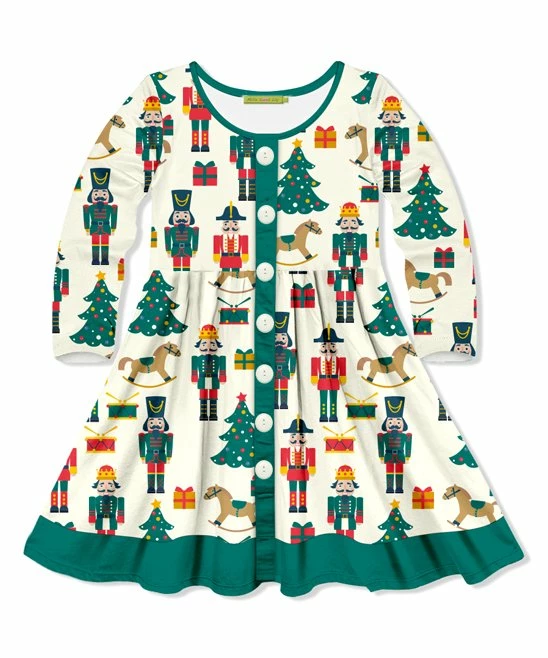 Charm your sweetie’s holiday looks in this A-line, ruffle-hem dress featuring nutcracker, rocking horse, gift and other themed patterns.