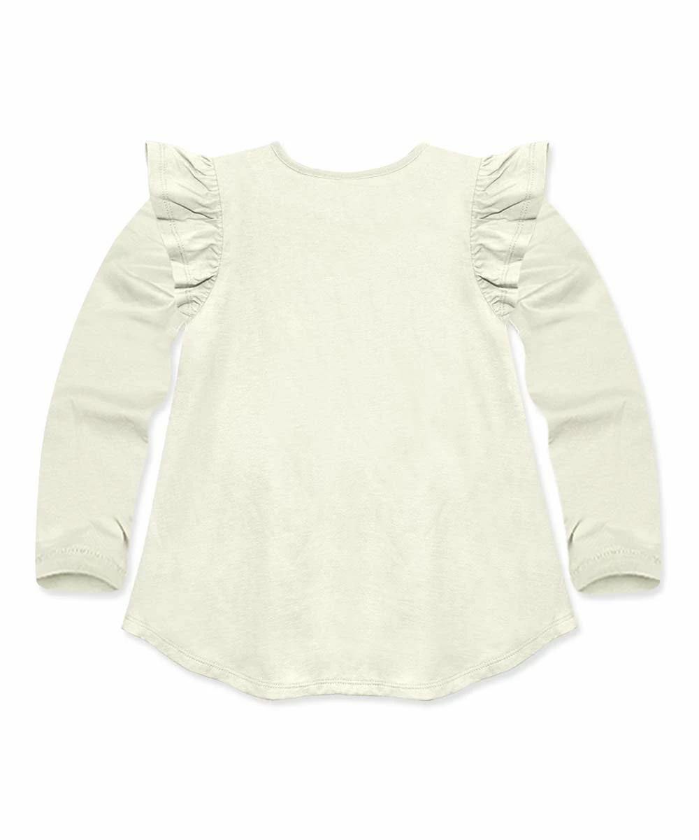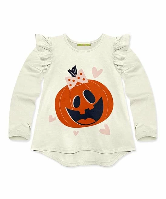 This long-sleeve hi-low top features a Halloween-themed graphic and ruffle accents.