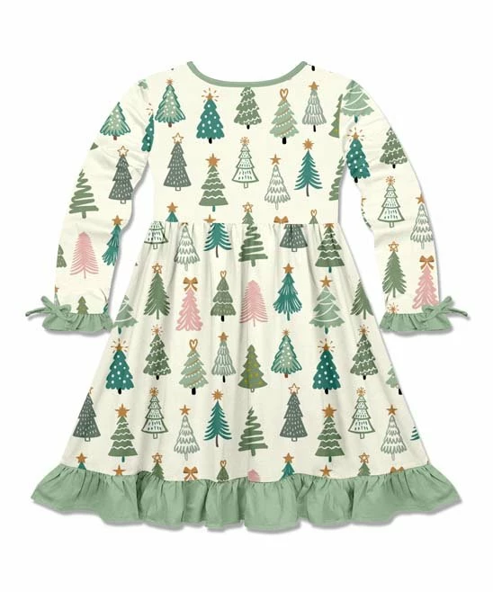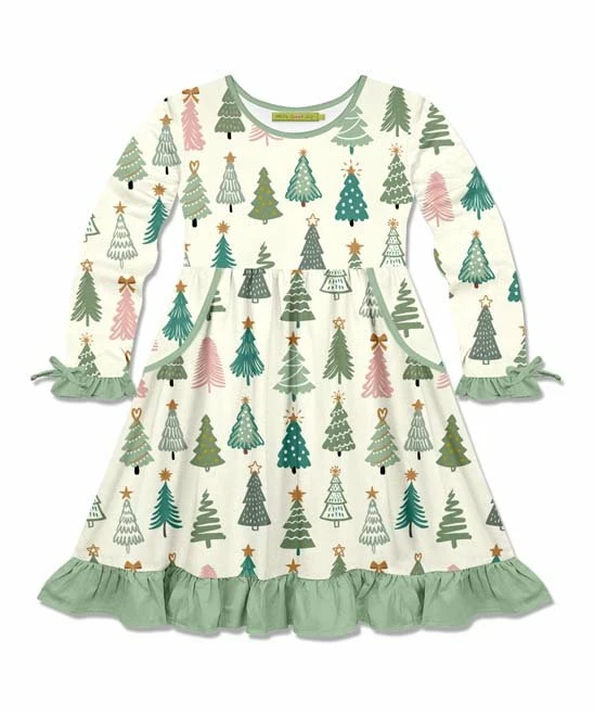 Bow poet sleeves and a ruffle hem adorn this A-line dress made with stretch-rich material and built-in pockets.