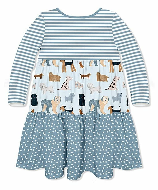 Long-sleeve A-line dress with different-printed tiers and a trio of buttons at the neckline.