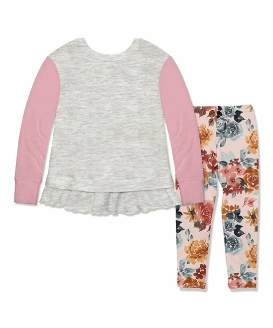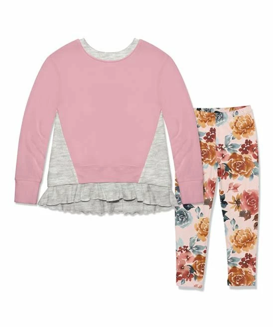 - Includes a dusty pink ruffle-hem French terry sweater and autumn floral leggings (two pieces total)