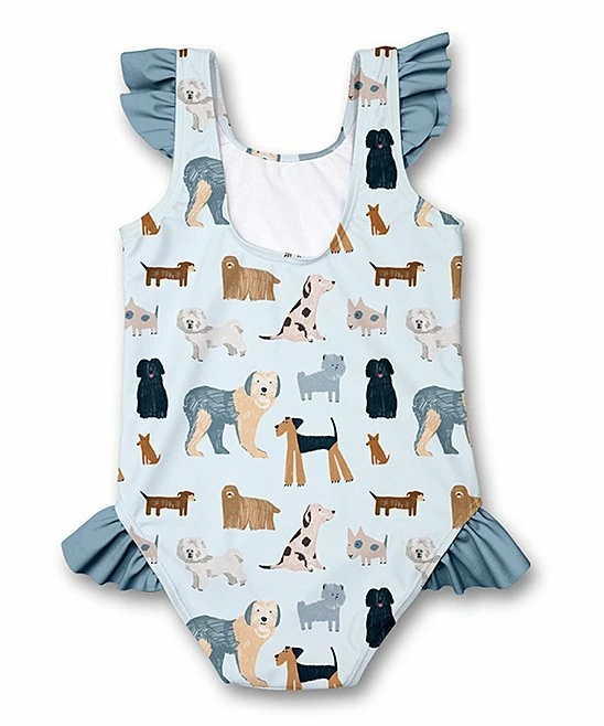 Little ones splash around in style wearing this one-piece featuring adorable dog prints and ruffle details. A rating of UPF 50+ helps protect from sun exposure.