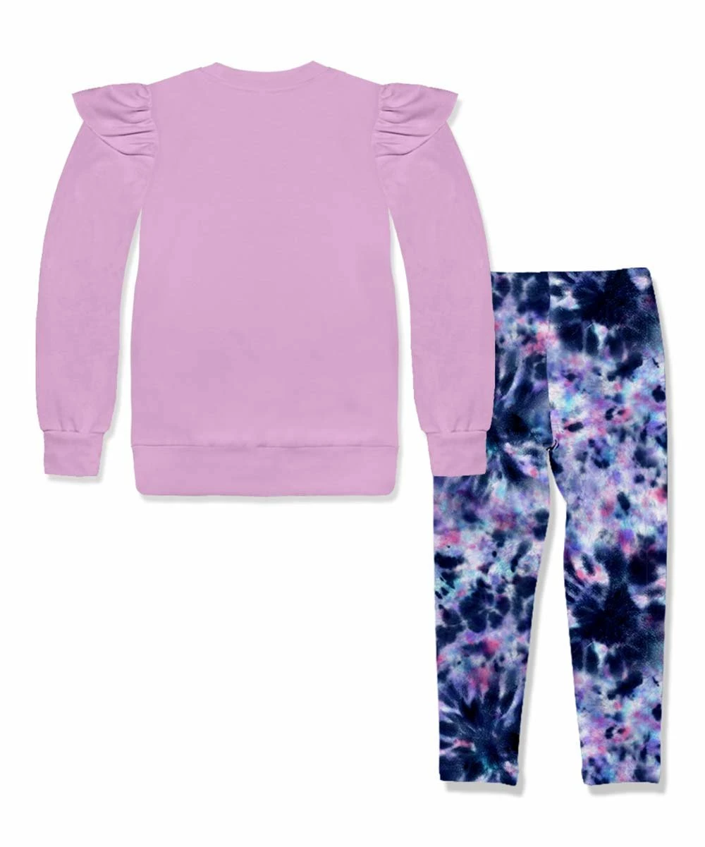 - Includes lilac ruffle-trim top and navy tie-dye leggings (two pieces total)
