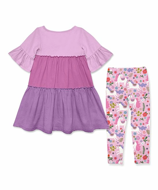 - Includes lilac and violet tiered A-line dress and pink darling unicorn leggings (two pieces total)