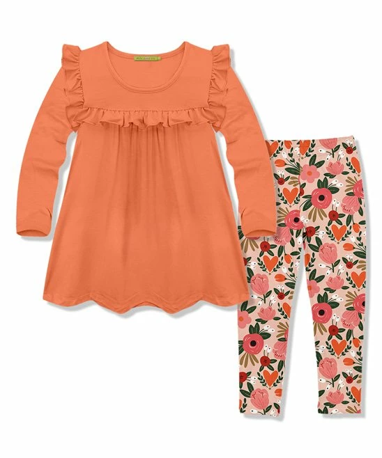 - Includes melon long-sleeve top and peach floral leggings (two pieces total)