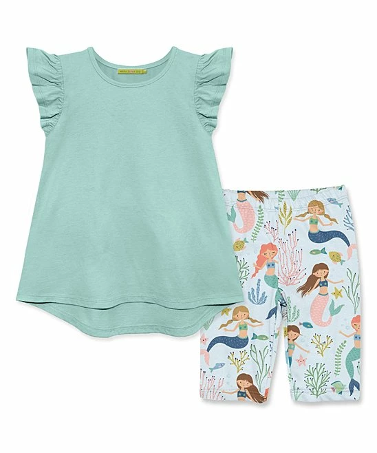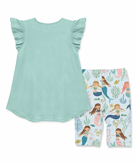 - Includes mint angel-sleeve hi-low top and coral reef mermaid bike shorts (two pieces total)