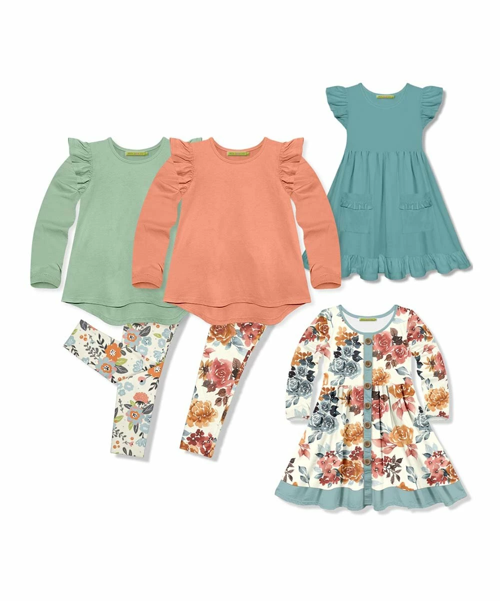 - Includes one coral hi-low top, one mint hi-low top, one teal angel-sleeve dress, one rose and cream floral long-sleeve dress, one pair of rose and cream floral leggings, and one pair of rose and blue floral leggings (six pieces total)