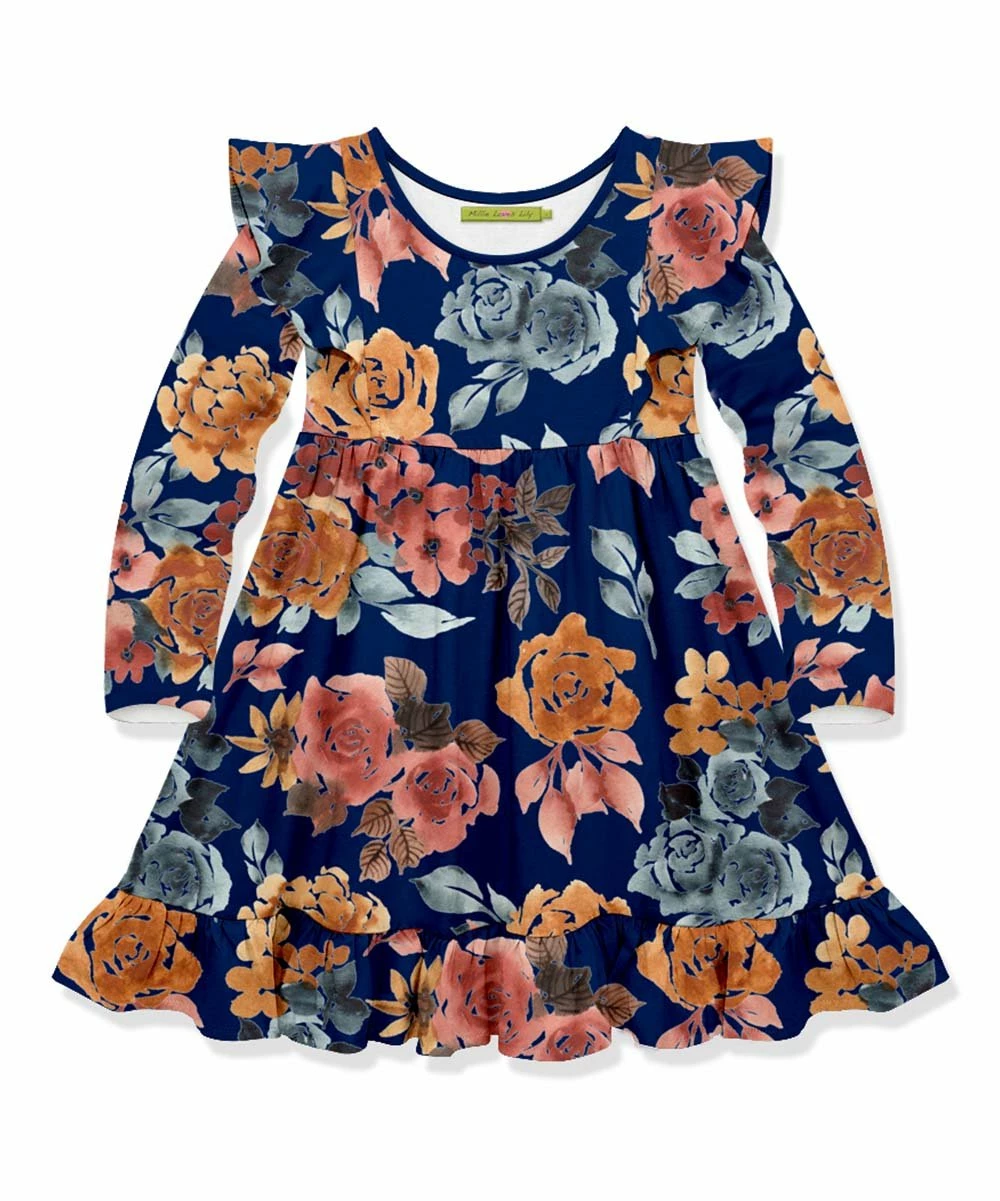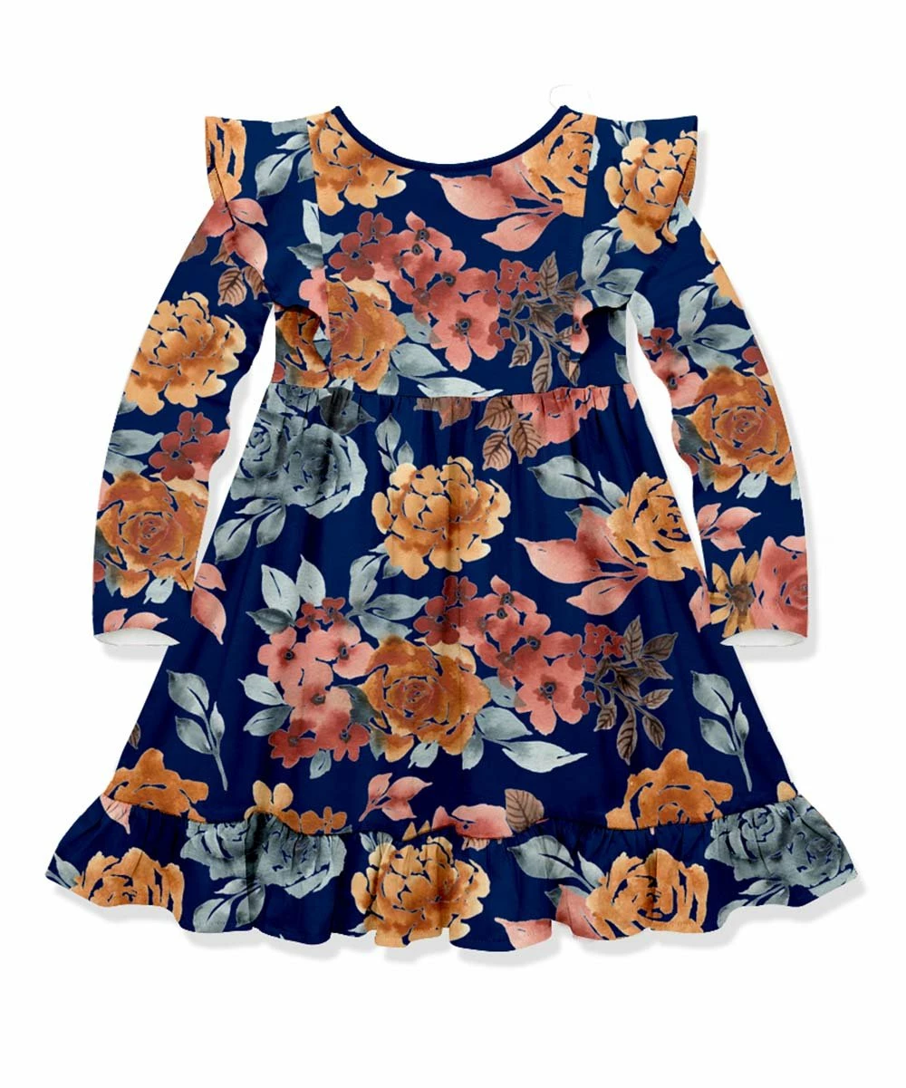 Ruffle-trimmed A-line dress featuring a floral-fresh pattern and stretch-enhanced material.
