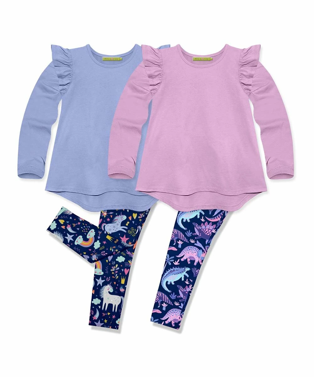 - Includes one lilac hi-low top, one navy hi-low top, one pair of navy unicorn leggings and one pair of navy dinosaur leggings (four pieces total)