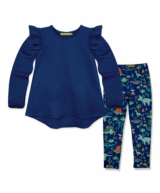 - Includes a navy ruffle long-sleeve hi-low top and demo dino leggings (two pieces total)