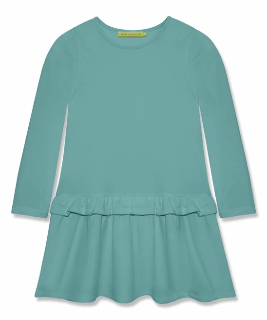 A one-and-done ensemble, this soft French terry dress features a dropped waistline accented with fun ruffles for twirl-ready wear.