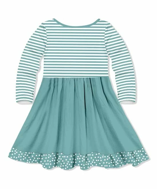 Stretchy fabric keeps them comfy in this long-sleeve A-line dress with a fun graphic and dainty ruffles.