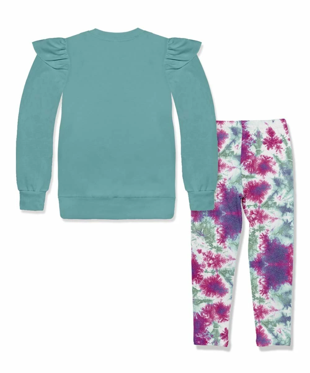 - Includes lilac ruffle-trim top and navy tie-dye leggings (two pieces total)