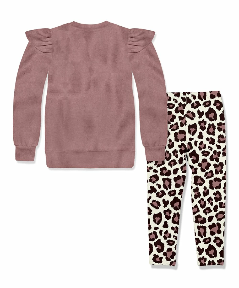 - Includes a nostalgia rose waffle angel-sleeve sweatshirt and simply skin leopard leggings (two pieces total)