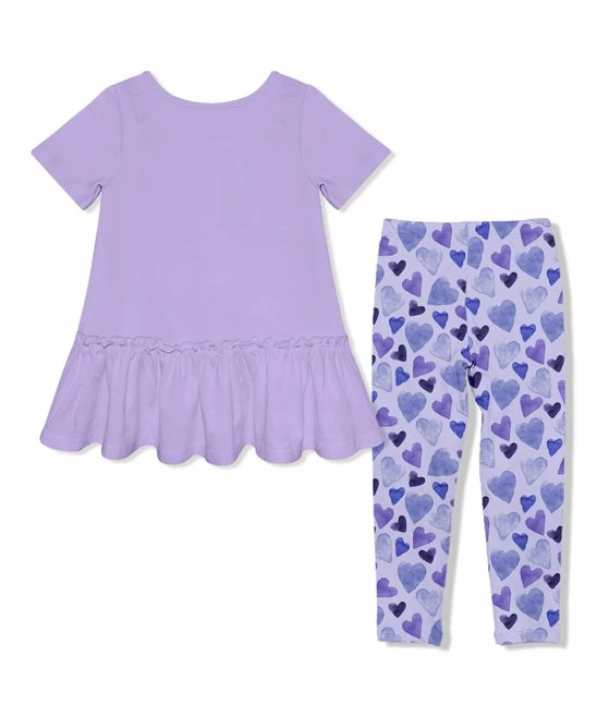 - Includes one orchid petal short-sleeve ruffle-hem peplum top and one pair orchid and purple heart leggings (two pieces total)
