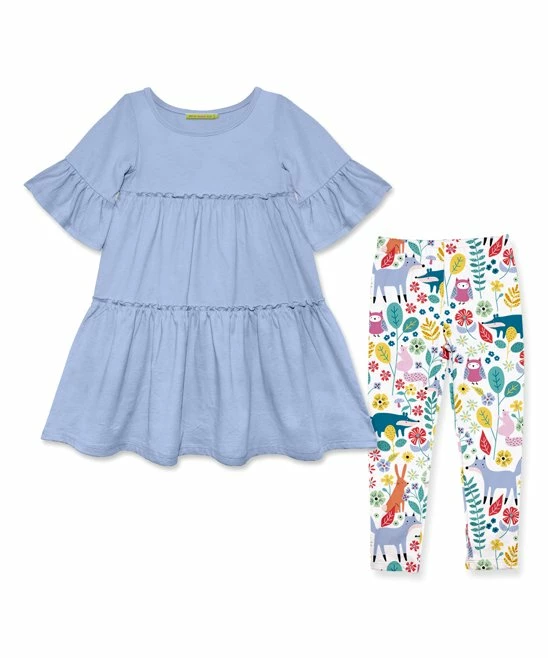 - Includes periwinkle A-line dress and white multicolor woodland leggings (two pieces total)