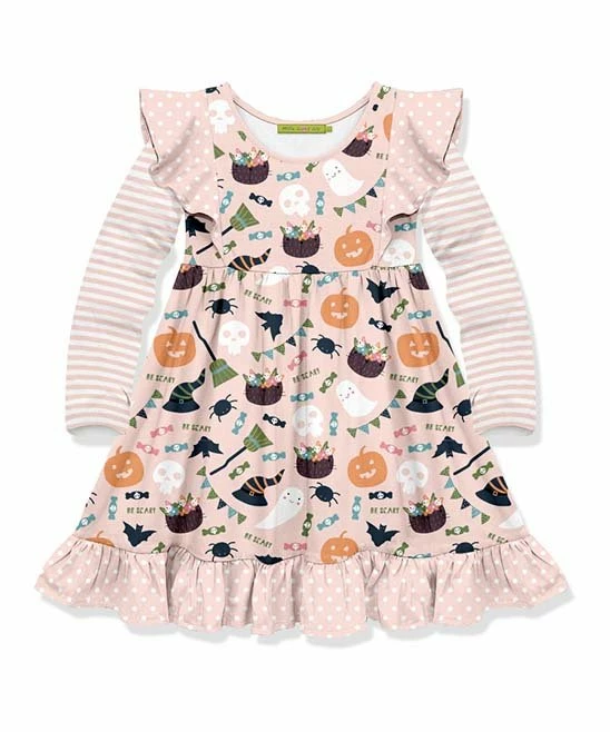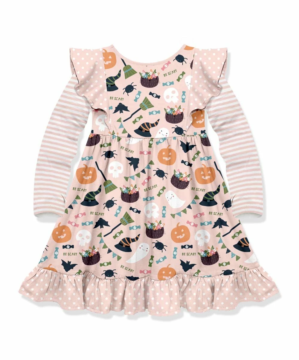 Get your little pumpkin into the spirit of the season with this stretchy A-line dress that flaunts a festive mix of prints. Ruffles line the shoulders and hem, bringing it to a sweet finish.