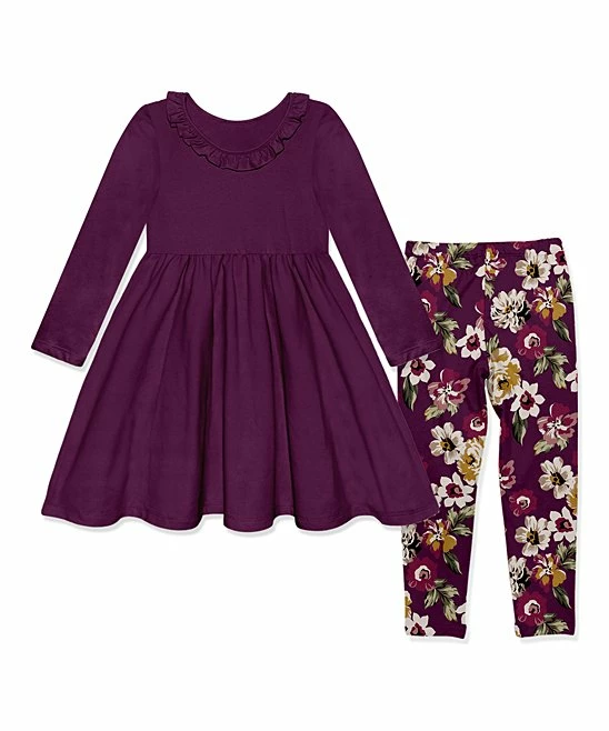 - Includes plum long-sleeve A-line dress and plum floral earth leggings (two pieces total)