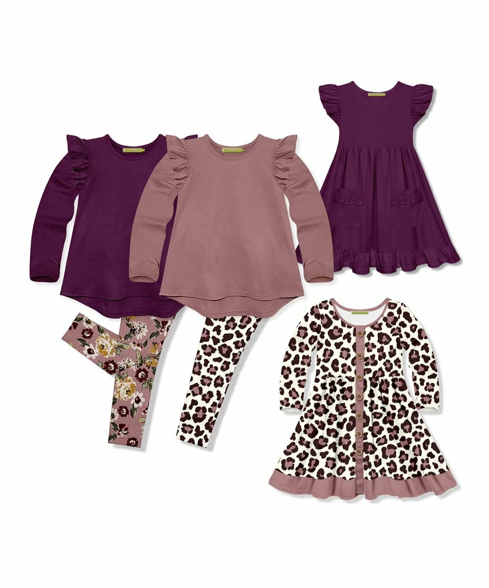 - Includes one plum hi-low top, one rose hi-low top, one plum angel-sleeve dress, one brown and white leopard long-sleeve dress, one pair of brown and white leopard leggings, and one pair of plum floral leggings (six pieces total)