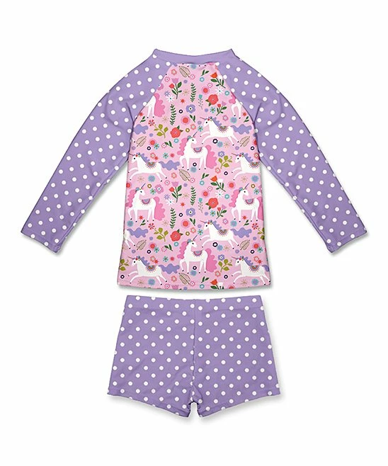 - Includes purple and pink lucky unicorn long-sleeve raglan rashguard and purple and white polka dot unicorn swim shorts (two pieces total)