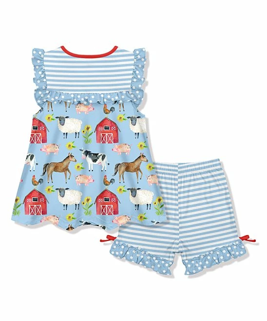 - Includes sky blue, white and red farm stripe polka dot top and sky blue, white and red stripe polka dot shorts (two pieces total)