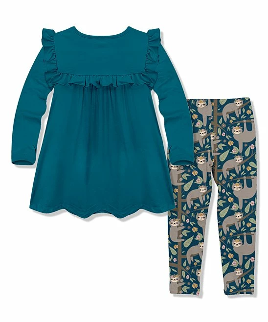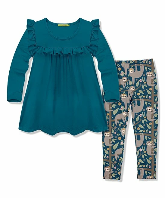 - Includes one teal long-sleeve top and one blue and gray happy sloths leggings (two pieces total)