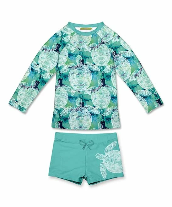 - Includes a turquoise tie-dye turtle long-sleeve rashguard and turquoise turtle swim shorts (two pieces total)
