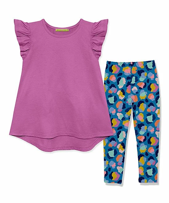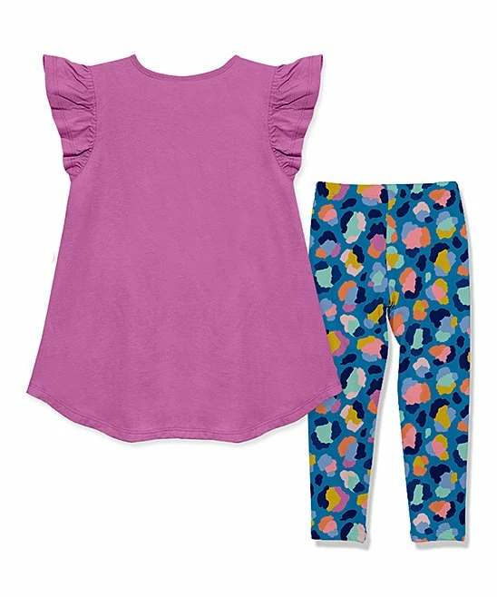 - Includes violet angel-sleeve hi-low top and navy and violet technicolor leopard leggings (two pieces total)
