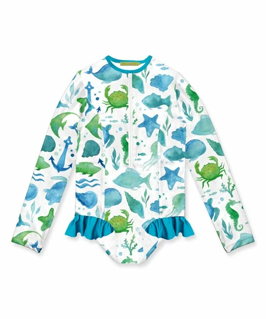 Protect them from the effects of sun and surf with this ruffled one-piece rashguard featuring long sleeves and a front zipper for dressing ease.