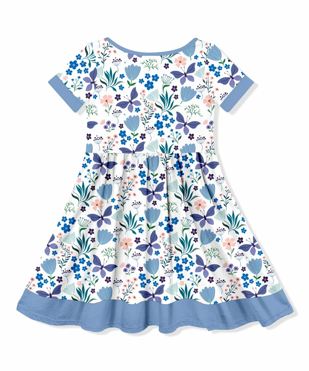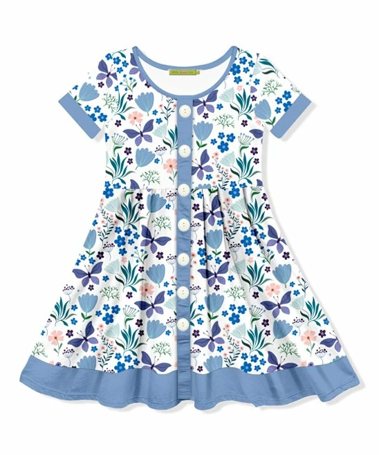 Get your little one ready for school or a day of play with this A-line dress decorated in a charming print and button accents.