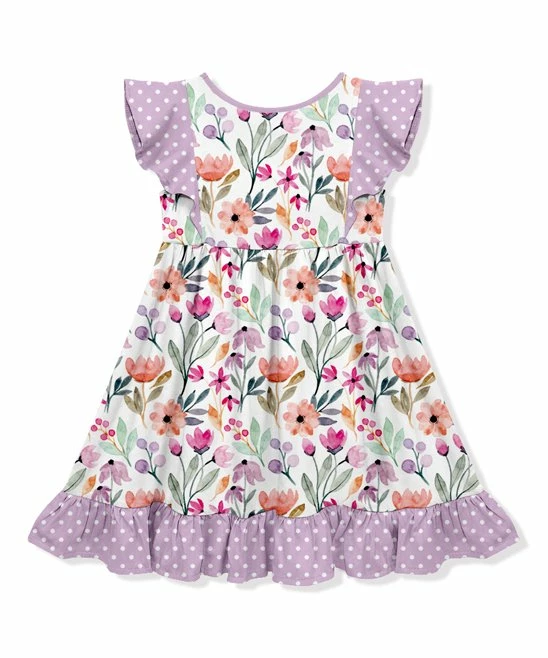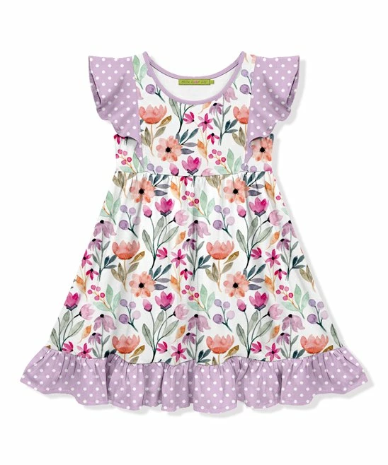 Printed A-line dress features delicately ruffled angel sleeves and hem.