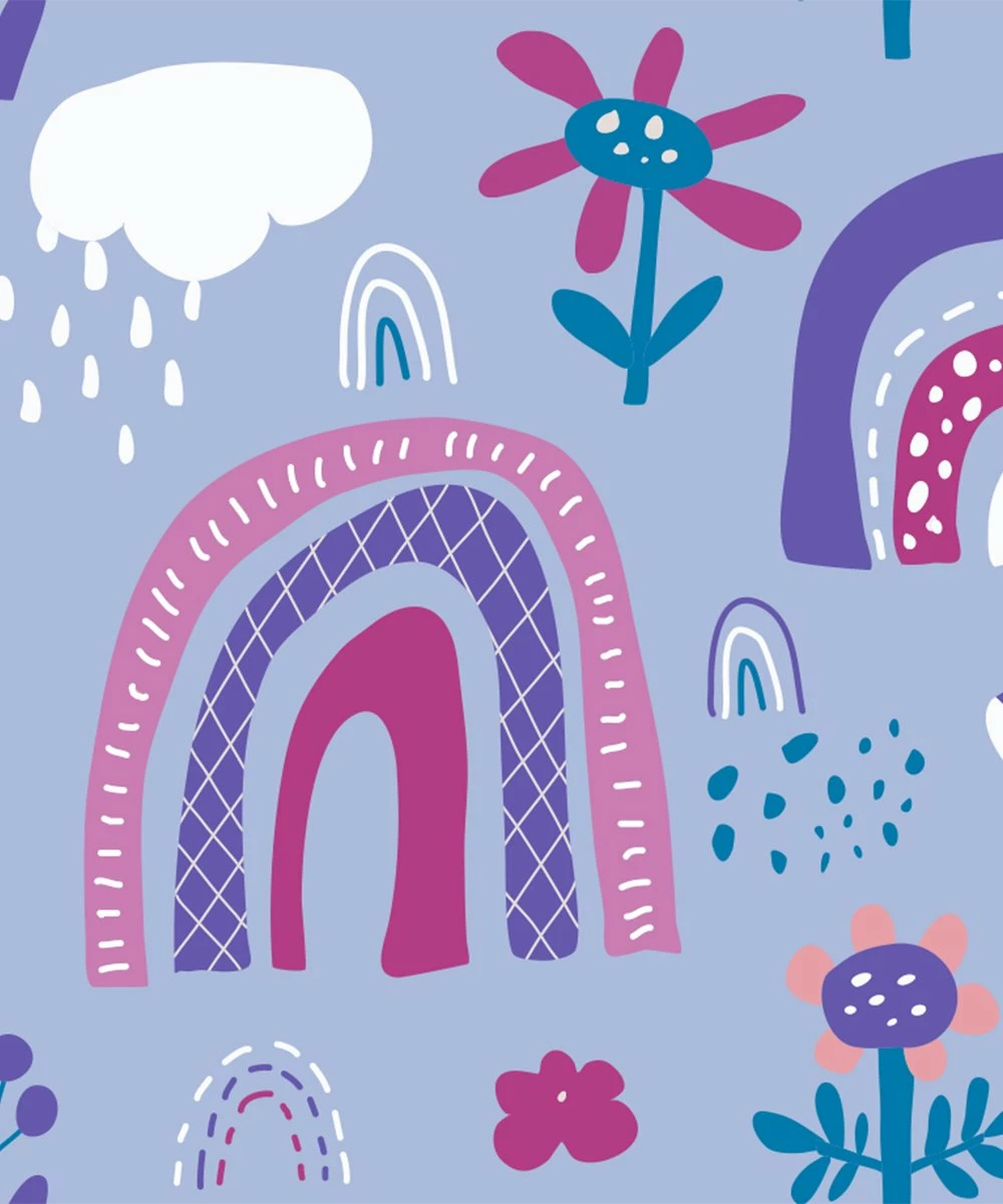 - Includes one white top, one periwinkle top, one periwinkle floral angel-sleeve dress, one periwinkle button-front top, one pink floral leggings and one periwinkle rainbow leggings (six pieces total)