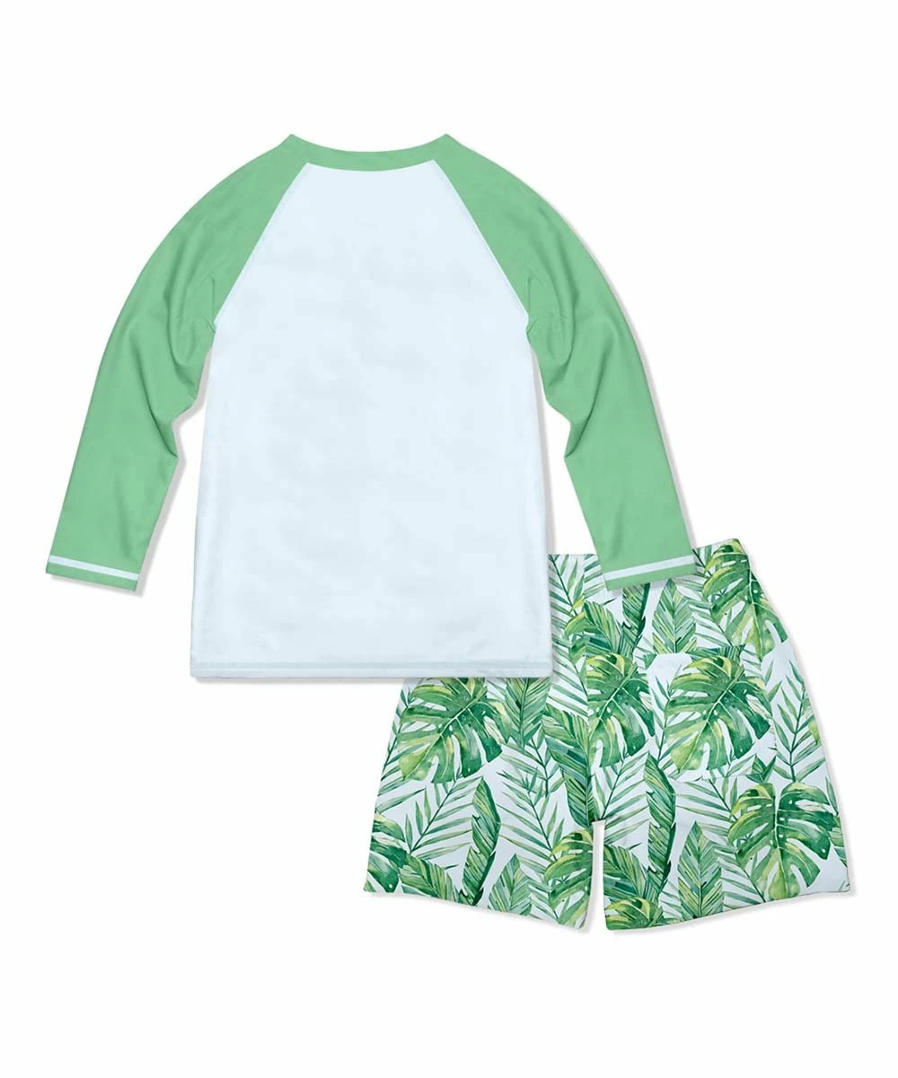 - Includes a pale blue and green tropical long-sleeve rashguard and pale blue and green tropical swim trunks (two pieces total)