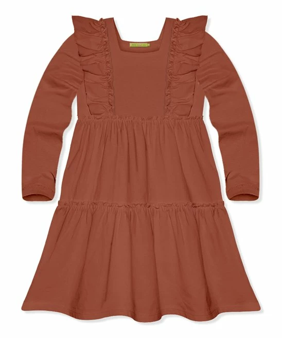 Long-sleeve A-line dress made with cotton material and fashioned with angel sleeves. Tiered ruffles complete the look.
