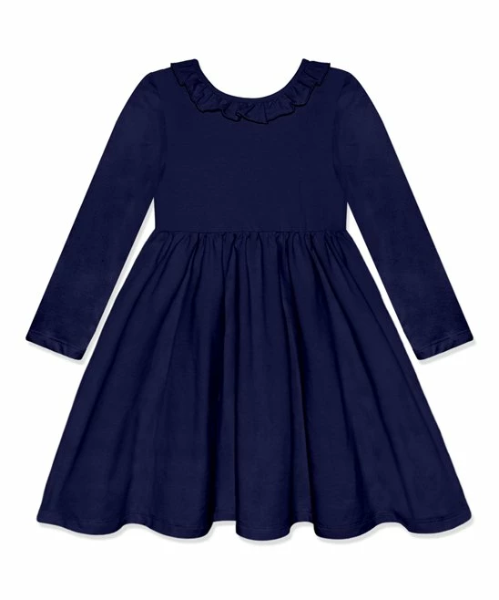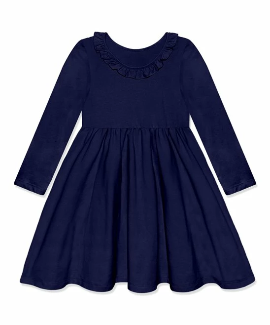 This A-line dress is designed with a ruffled neckline and long sleeves.